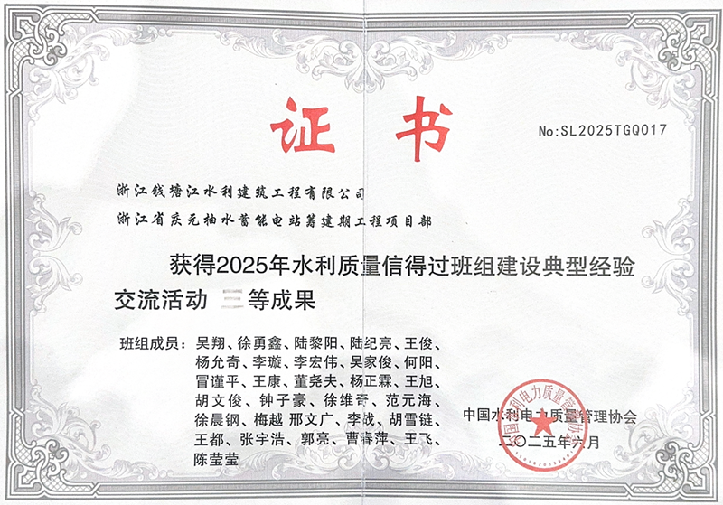近日,中國水利電力質(zhì)量管理協(xié)會公布2025年度水利質(zhì)量信得過班組建設(shè)典型經(jīng)驗交流活動評選結(jié)果,慶元抽蓄籌建期EPC總承包項目憑借扎實有效的質(zhì)量管理實踐和突出的建設(shè)成果,榮獲“2025年水利質(zhì)量信得過班組建設(shè)典型經(jīng)驗交流活動”三等成果。這一榮譽(yù)不僅為“浙錢水建”品牌再添光彩,更標(biāo)志著公司在工程質(zhì)量管理領(lǐng)域獲得了行業(yè)權(quán)威機(jī)構(gòu)的高度認(rèn)可。