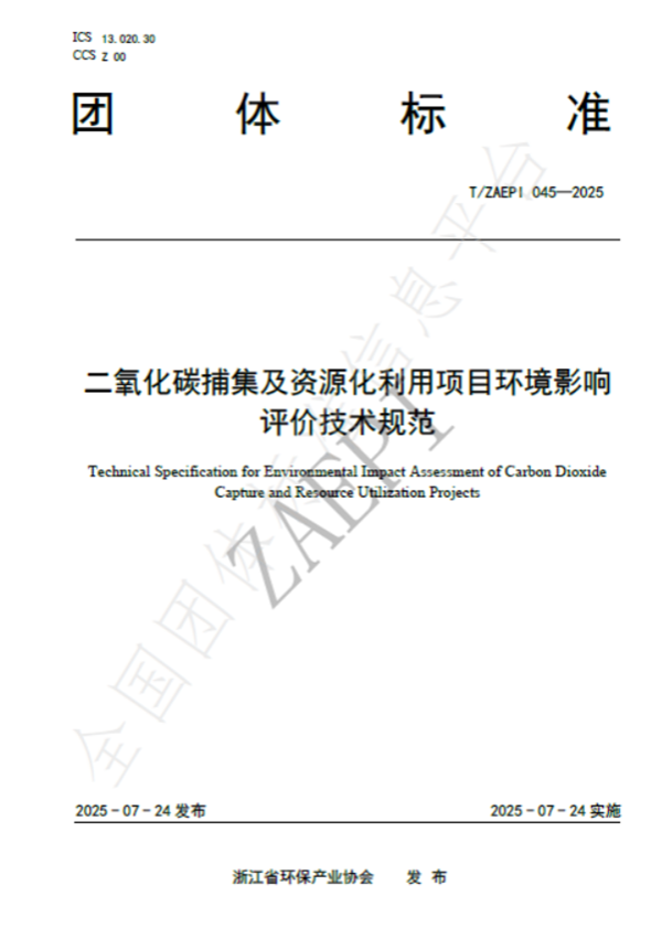 2025年7月24日,由浙江省環(huán)保集團(tuán)生態(tài)環(huán)保研究院牽頭制定的《二氧化碳捕集及資源化利用項目環(huán)境影響評價技術(shù)規(guī)范》(T/ZAEPI 045-2025)團(tuán)體標(biāo)準(zhǔn)正式發(fā)布并實施。該標(biāo)準(zhǔn)由浙江省環(huán)保產(chǎn)業(yè)協(xié)會歸口管理,聯(lián)合省內(nèi)多家環(huán)保領(lǐng)域骨干企業(yè)共同起草,填補(bǔ)了工業(yè)領(lǐng)域二氧化碳捕集及資源化利用項目環(huán)評技術(shù)規(guī)范的空白。